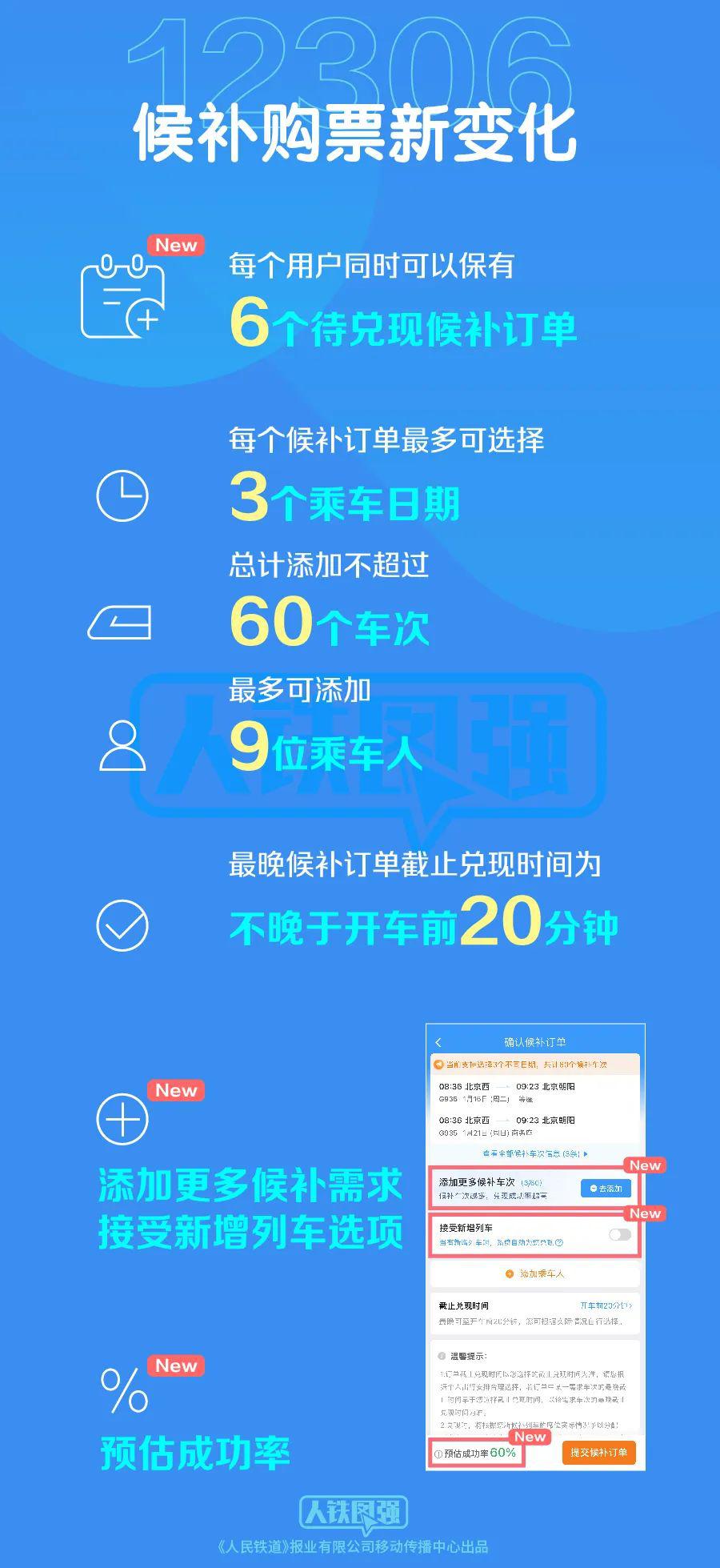 铁路 12306 科创中心相关负责人介绍,为提升旅客购票体验,铁路部门加大研发力度,对铁路 12306 候补购票功能进行了优化升级。一是增加候补订单数量。每名旅客可提交的待兑现候补订单数量由 2 个增至 6 个,每个订单最多可添加 9 名乘车人。二是增加备选方案数量。原来旅客提交候补订单时,可选择相邻 2 个乘车日期、每个日期可选择 5 个 " 车次 + 席别 " 的组合,最多可选择 10 个组合。优化升级后,旅客可选择预售期内任意 3 个乘车日期,累计最多可选择 60 个 " 日期 + 车次 " 的组合,每个车次可选多个席别。三是扩大候补订单兑现时间选择范围。原来候补订单截止兑现时间最晚为开车前 2 小时,优化升级后调整为开车前 20 分钟,旅客可在更大范围内根据实际情况自主选择修改截止兑现时间。四是临时新增旅客列车席位优先配售给已提交候补订单的旅客。旅客在提交候补订单时,可选择接受购买符合出行需求的新增旅客列车车票,如铁路部门临时新增旅客列车,在车票起售时,铁路 12306 将自动优先配售给已提交候补订单的旅客,旅客无需人工查询增开列车信息再购票。