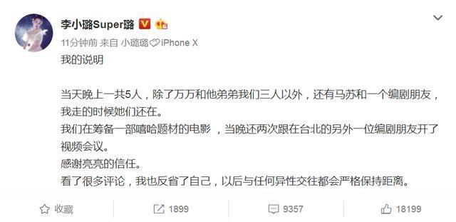 当天晚上一共5人,除了万万和他弟弟我们三人以外,还有马苏和一个编剧朋友,我走的时候她们还在。 我们在筹备一部嘻哈题材的电影 ,当晚还两次跟在台北的另外一位编剧朋友开了视频会议。 感谢亮亮的信任。 看到李小璐的说明,网友总算松了一口气,事情真相跟大家想的是一样的。这只是别有用心的一场闹剧。那个所谓爆料的网友又会是谁?