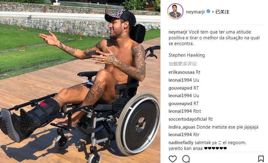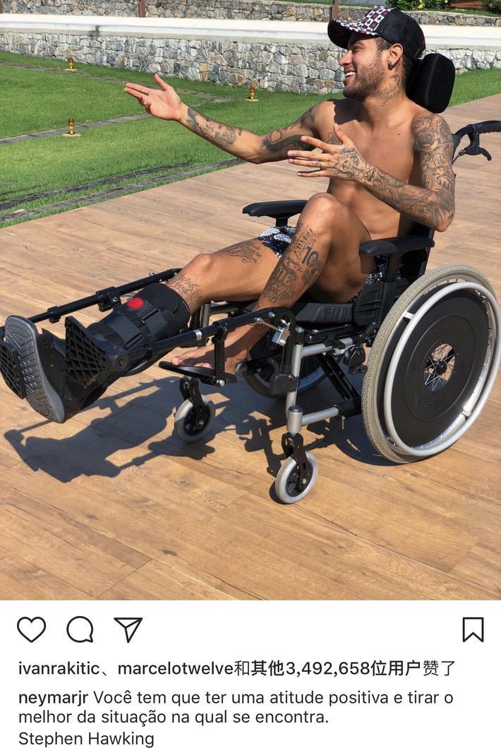 照片中,正在养伤的内马尔坐在轮椅上,做出与人交谈状,并配上文字,“你必须拥有积极的心态,在任何处境中都展现最好的自己——斯蒂芬·霍金。”这是霍金的名言。