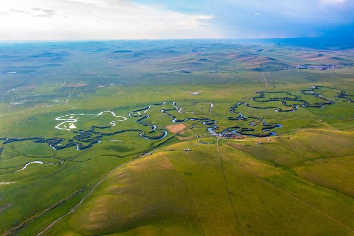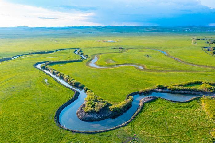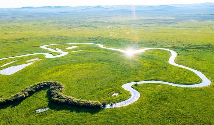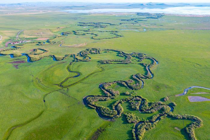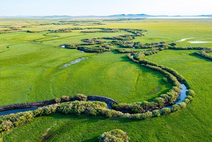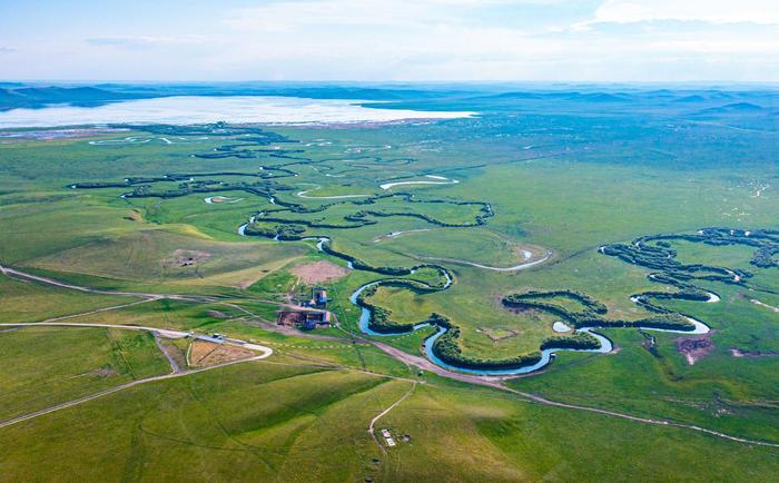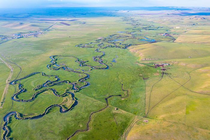 初夏时节,位于内蒙古自治区锡林郭勒盟东北部的乌拉盖草原风景宜人,蔚蓝色的天幕下,绿色的草原广阔无垠,蜿蜒流淌的乌拉盖河绵延向远方,美如画卷。
