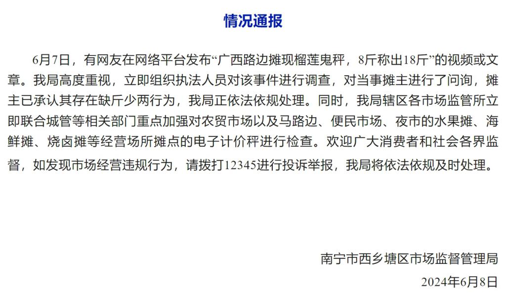 6 月 8 日,南宁市西乡塘区市场监督管理局就 " 广西路边摊现榴莲鬼秤,8 斤称出 18 斤 " 一事作出《情况通报》: