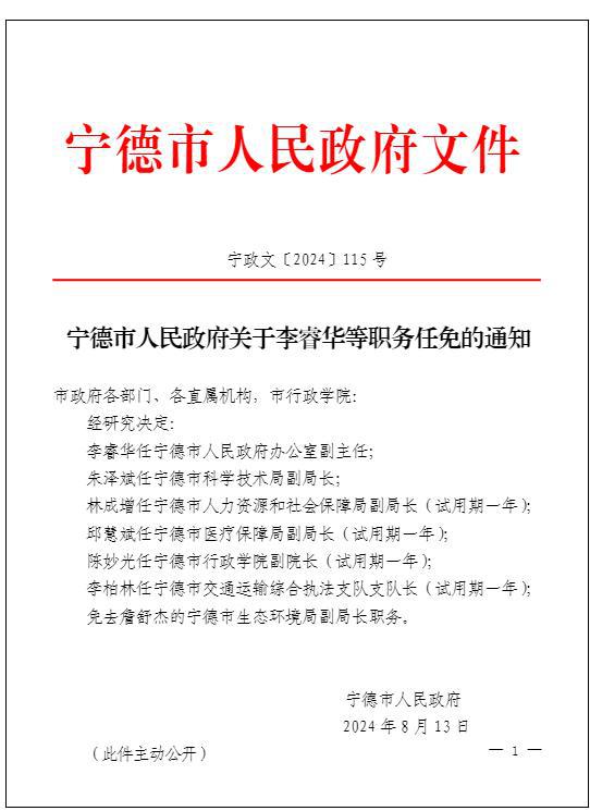 宁德市政府网站 8 月 16 日发布消息,李睿华任宁德市人民政府办公室副主任。