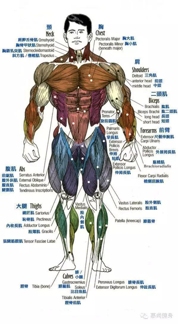 工欲善其事,必先利其器!分享几张人体全身肌肉分布图,给不明白人体肌肉分布的健友们一个参考,因为是全身肌肉分布,肌肉名称太多,所以字体有点小,建议大家将图片放大了看。