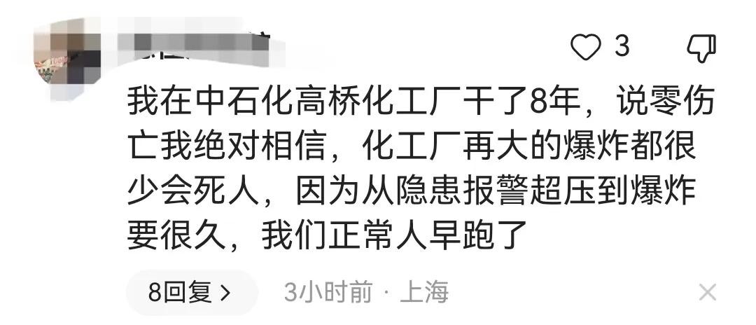 另有一位有化工厂经验的知情人透露,说化工厂零伤亡,他信,因为从隐患报警超压到爆炸要很久。报警后正常人早跑了。
