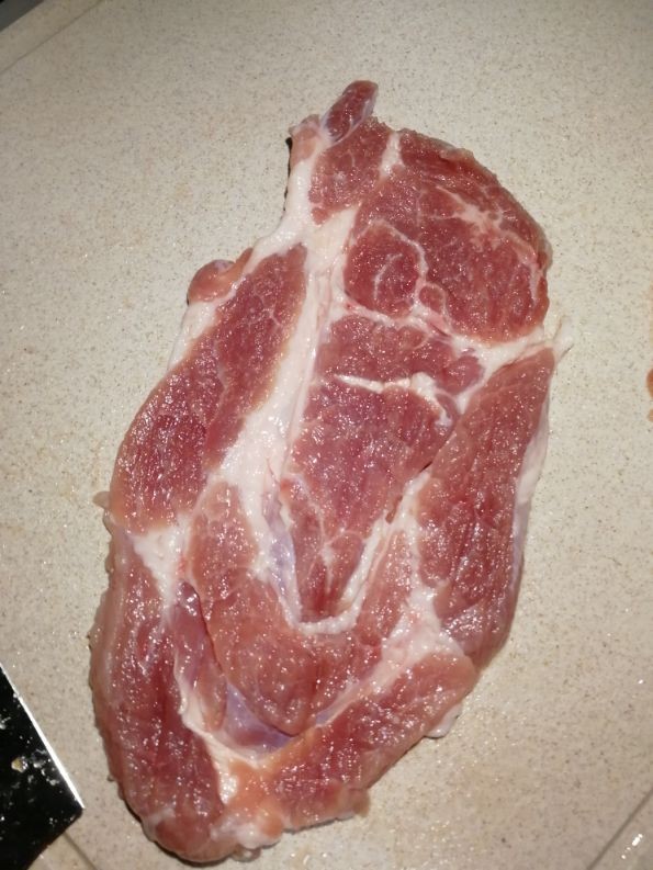 上超市买东西,被卖猪肉的阿姨8折的肉价所吸引,过去一看还真不错,一盒猪夹心里有两块,打完折才14块钱,很划算,而且瘦中带点肥,是属于前腿肉,肉贩切的好像牛扒的形状,灵机一动,用来做猪扒,也是个不错的选择,立马回家动手。