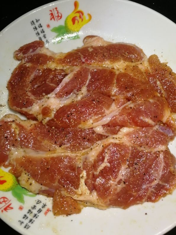 猪夹心,已经是切薄片的了,洗干净后用刀背跺一下猪夹心,使肉拍散一点,两面都要,注意掌握好力度,不要跺碎跺断了,这样腌制起来会更入味,煎起来也易熟