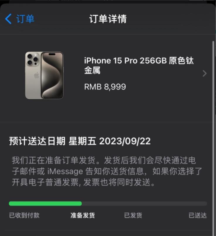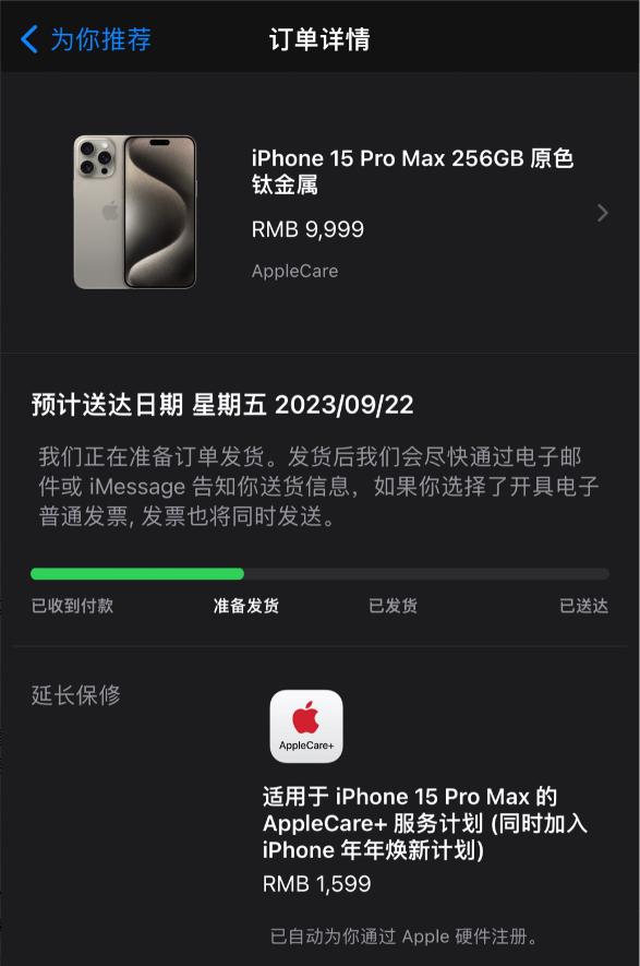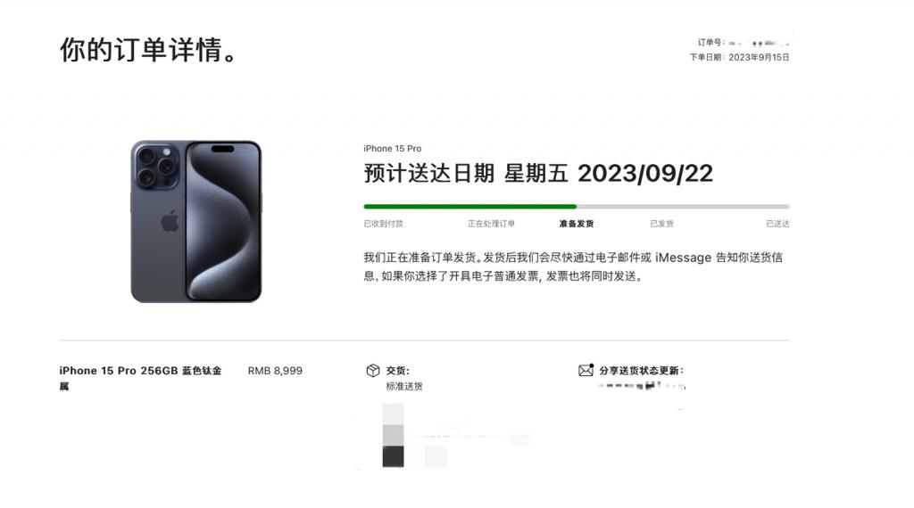 首批 iPhone 15 Pro 系列机型状态更新为“准备发货”