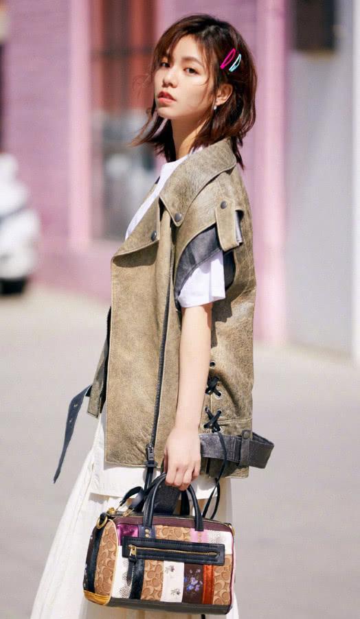 现在的她也是很多种风格的穿搭也可以轻松驾驭的呢,她身穿一件皮衣的马甲,内搭一件白色的T桖,这样的搭配很有层次感,看着很是时髦的感觉,下身搭配一条黄色的半身裙,时髦感十足。