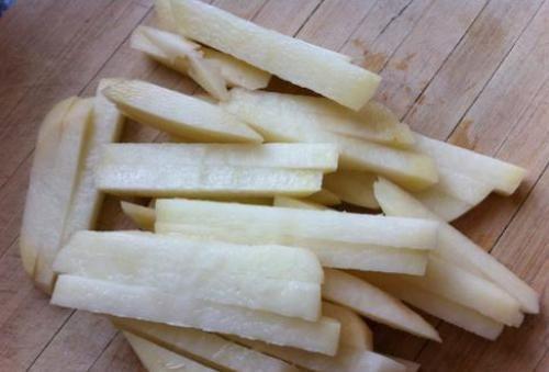 首先一点,是需要我们下准备食材,将土豆洗干净之后,再切成粗细长短都很均匀的长条,然后再把切好的土豆给浸泡一下,这么做不仅是会防止氧化,还可以洗掉土豆表面的淀粉, 避免炸的时候粘在一起。