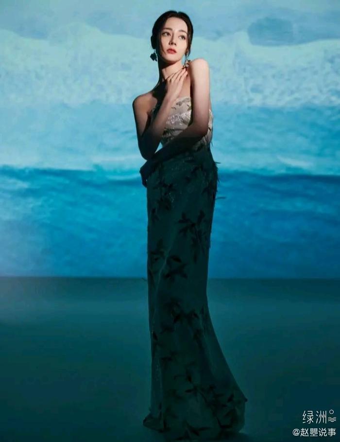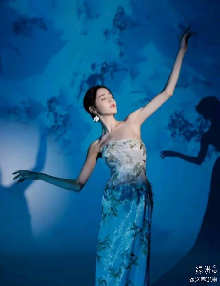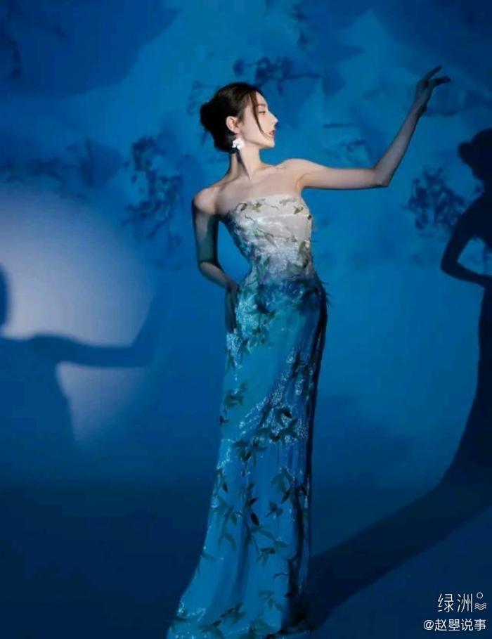 看完衣服表面水墨的设计,再看衣服款式的设计,整套衣服是半圆抹胸设计,自胸而上,不加修饰浑然天成,让我们看到了自然而然的迪丽热巴。图片中热巴手臂微微张开,锁骨将两侧手臂与脖颈处链接,颈部线条与手臂线条浑然天成,手指微微翘起,宛若一只等待飞起的天鹅。裙子上的水墨绿叶由羽毛点缀装饰,加上蓝色背景板和白底绿色的结合迪丽热巴好似有待开屏的孔雀般妖娆美丽。