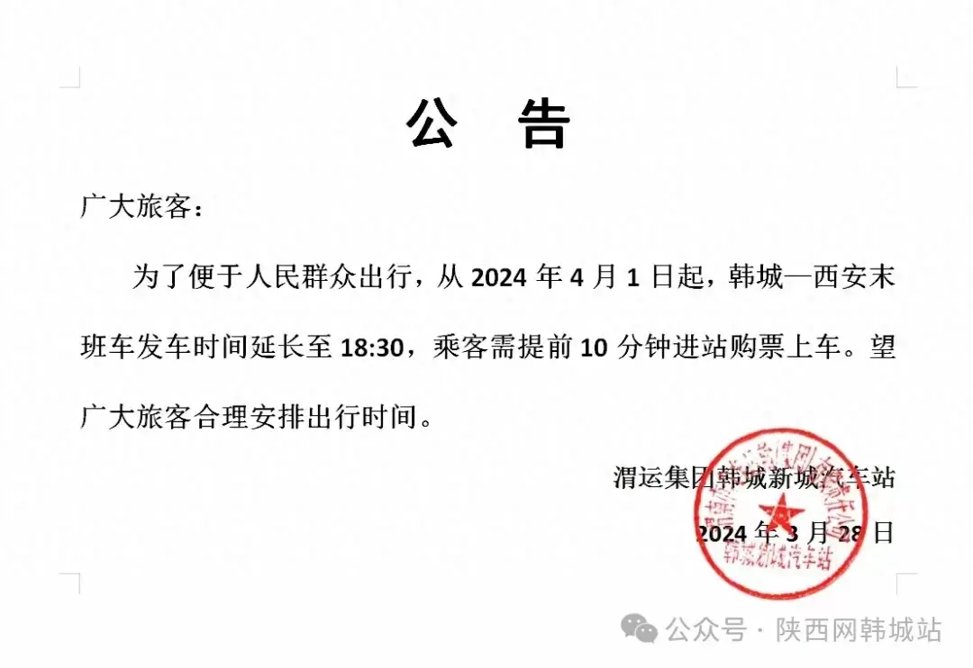 渭运集团韩城新城汽车站从2024年4月1日起,韩城--西安末班车发车时间延长至18:30,请各位乘客合理安排出行时间,提前进站购票,望相互告知。