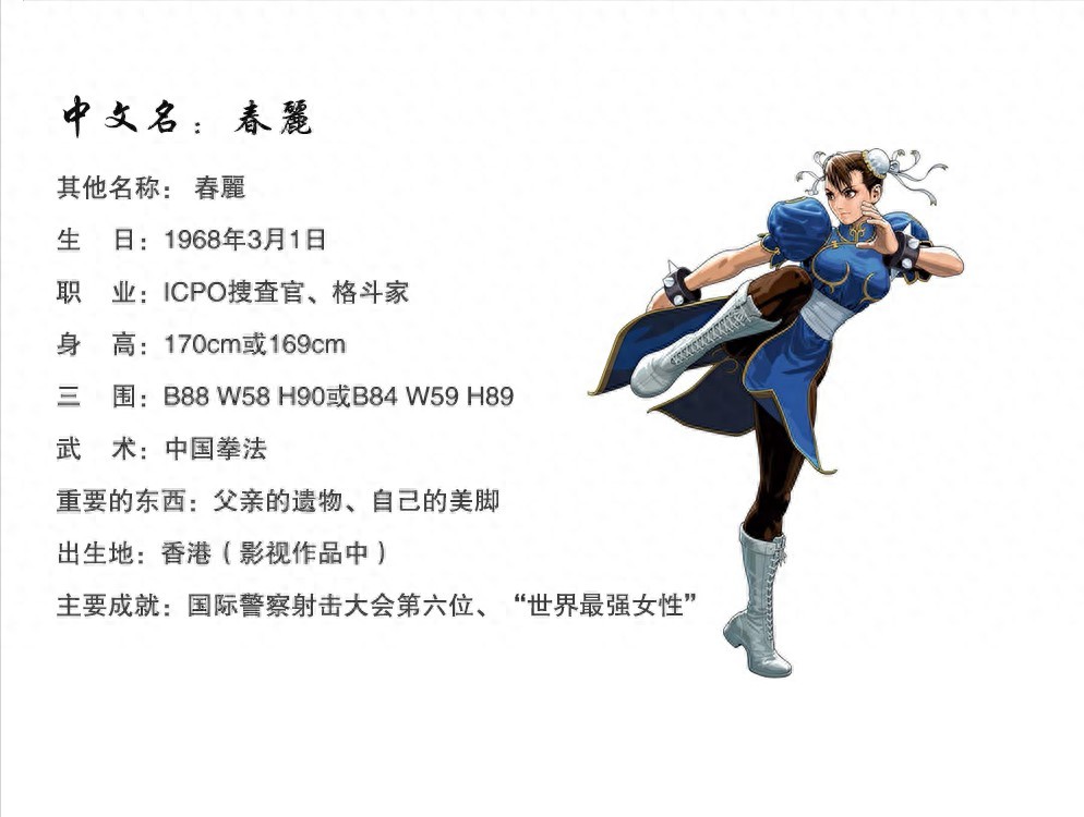 春丽是经典格斗游戏《街头霸王》系列中的原创虚拟女性角色,在游戏中春丽则代表中国的格斗选手。春丽是一位美丽漂亮的ICPO(国际刑警)特别调查员,除了精通中国武术外,还以第六位的成绩在国际警察射击大会上获奖,并获得了"世界最强女性"的称号,是个非常有实力的女性格斗家