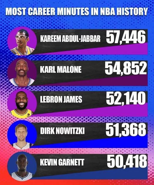 NBA历史5大出场王,司机51368分钟被低估,科比落榜,老詹第3