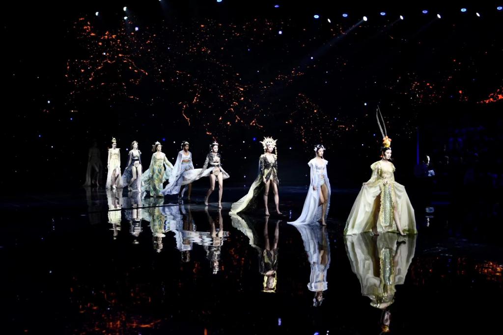 作为时尚与潮流交汇的产业盛会,第三届潮汕服博会最受瞩目的活动之一当属《潮起东方 3.0》开幕秀。羊城晚报全媒体记者在开幕秀现场看到," 秀场 " 以 " 无界 " 为主题,在行业内开创性采用 3000 平方米超大圆形秀场,可容纳观众近千人,打造出震撼的 " 声光电 " 沉浸式体验,以独特的视角和创新的手法,将不同国度、调性、风格和品类的多个品牌编写成海上丝绸之路的故事,通过 100 多位国内外超模的走秀演绎,全品类展示内衣、家居服、毛衫、时装等多种纺织服装的魅力、多方位呈现独一无二的设计,给观众带来绝美视觉享受的同时也揭晓了行业流行新方向。