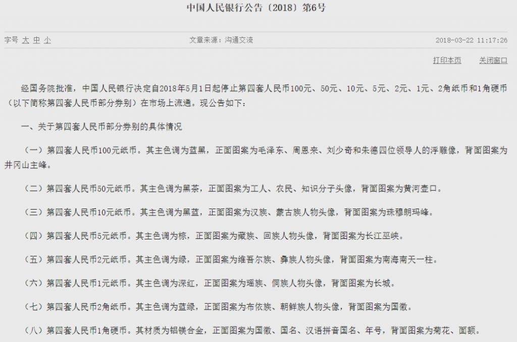 记者调查发现,在中国人民银行公告〔2025〕第 6 号中,其明确表示,中国人民银行决定自 2025 年 5 月 1 日起停止第四套人民币 100 元、50 元、10 元、5 元、2 元、1 元、2 角纸币和 1 角硬币在市场上流通。