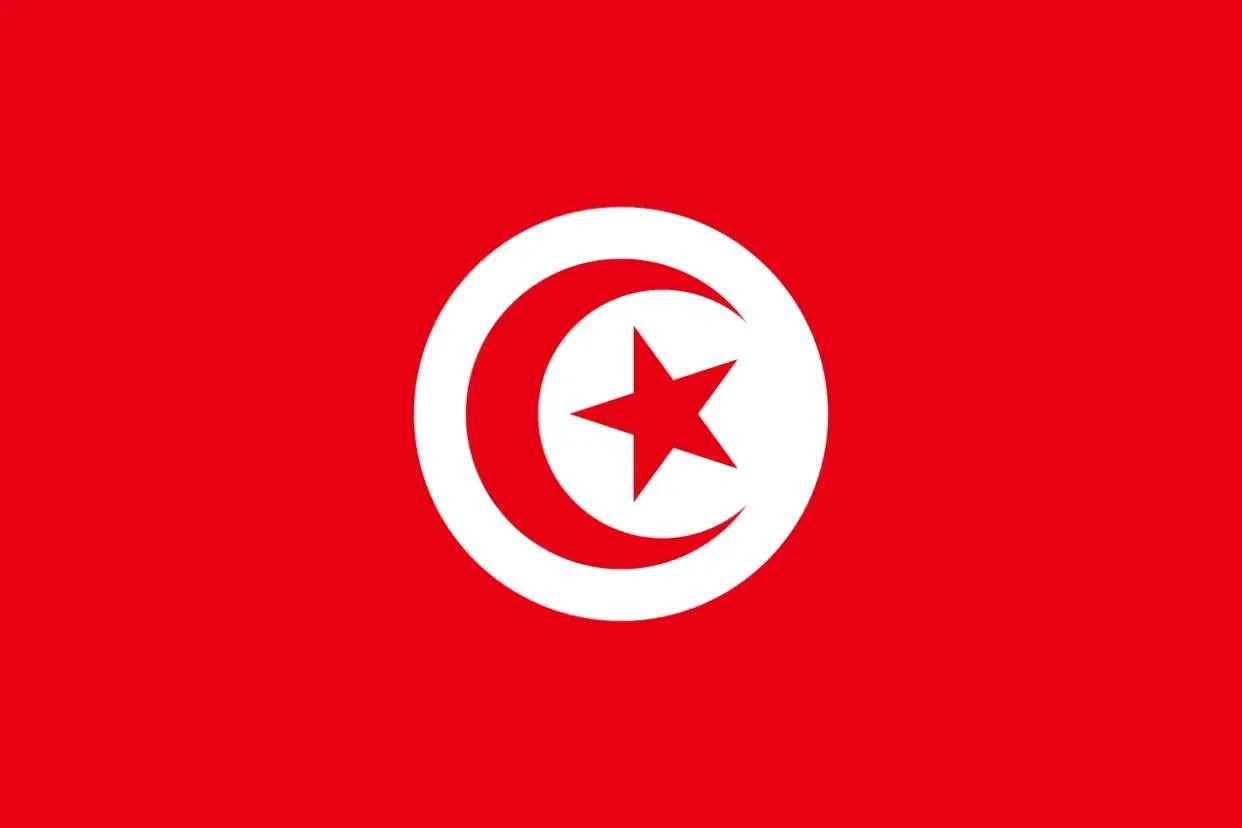 6.突尼斯国旗:红色背景中央有一白色圆地,其直径约为旗宽的一半,圆地中有一弯红色新月和一颗红色五角星。
