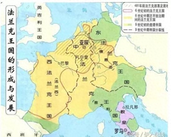 843年签署的《凡尔登条约》,查理曼帝国一分为三,其中西法兰克王国演变为现在的法国。