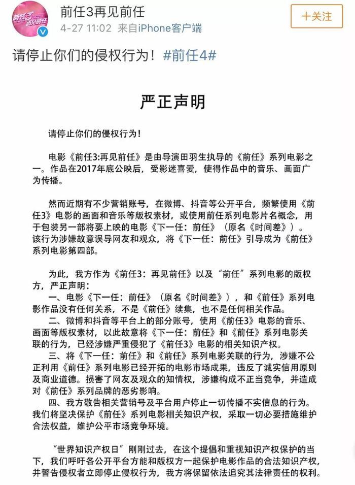 “前任4”话题在营销号带节奏下冲上微博热搜,都在误导吃瓜群众《下一任:前任》就是《前任4》,迫使正牌《前任》系列官博不得不出来辟谣。