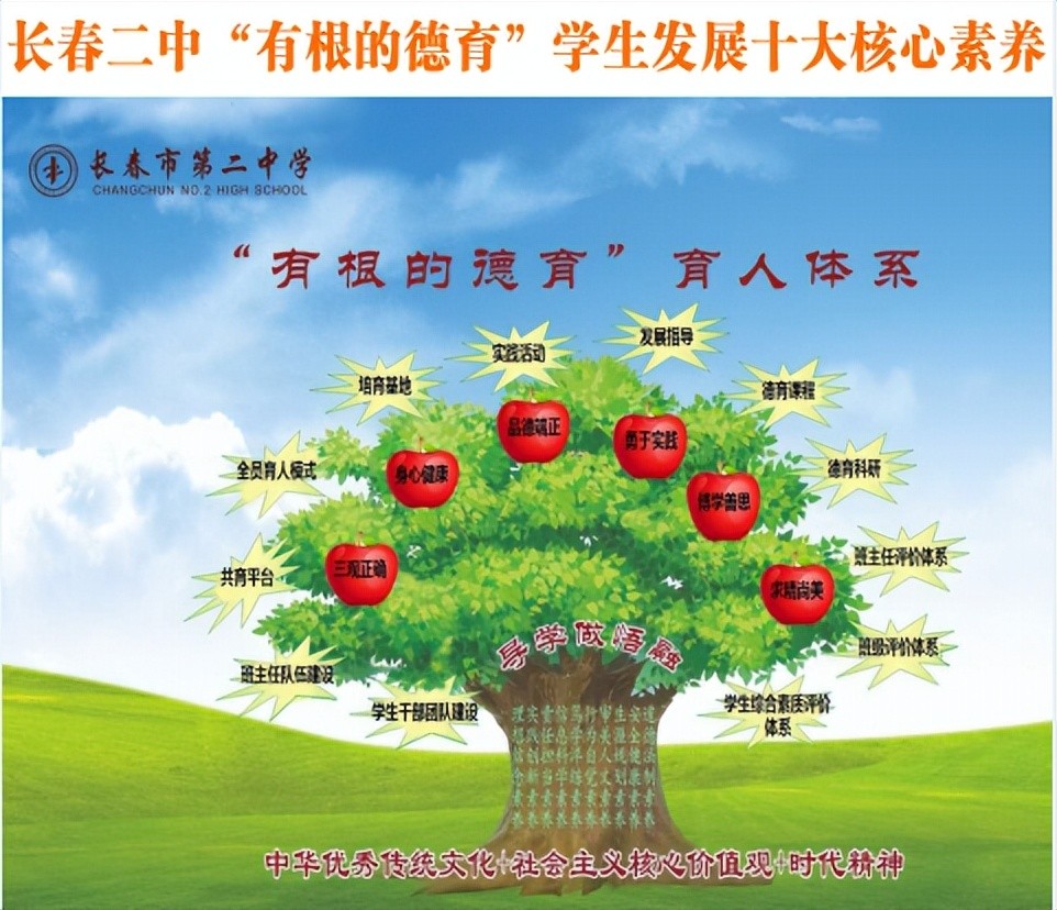 树立“大德育观”,不断完善长春二中“有根的德育”体系化建设,坚守“培养六学期,负责六十年”育人信念,长春二中一直以“严中有爱、爱中寓严、严爱相济”的学生管理享誉春城。实行全员、全天候封闭式管理,设有国内第一家校园警务室,建成360°校园无死角视频监控网络,为师生打造安全和谐的校园环境。学校连续多年被评为长春市平安校园示范校。构建“导、学、做、悟、融”德育工作路径,促进实践育人、文化育人、学科育人、家校合作育人。全面落实长春二中“有根的德育”学生发展十大核心素养要求,致力于培养品端德正、精思好学、身心健康、求精尚美、勇于实践的德智体美劳全面发展的社会主义建设者和接班人。