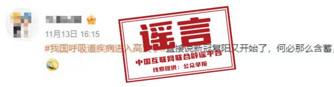 " 本轮呼吸道疾病是新冠复阳 " 的说法不实。据国家卫生健康委通报:近期我国急性呼吸道疾病增多,主要由流感引发,此外还由鼻病毒、肺炎支原体、呼吸道合胞病毒、腺病毒等多种呼吸道病原体叠加所致。
