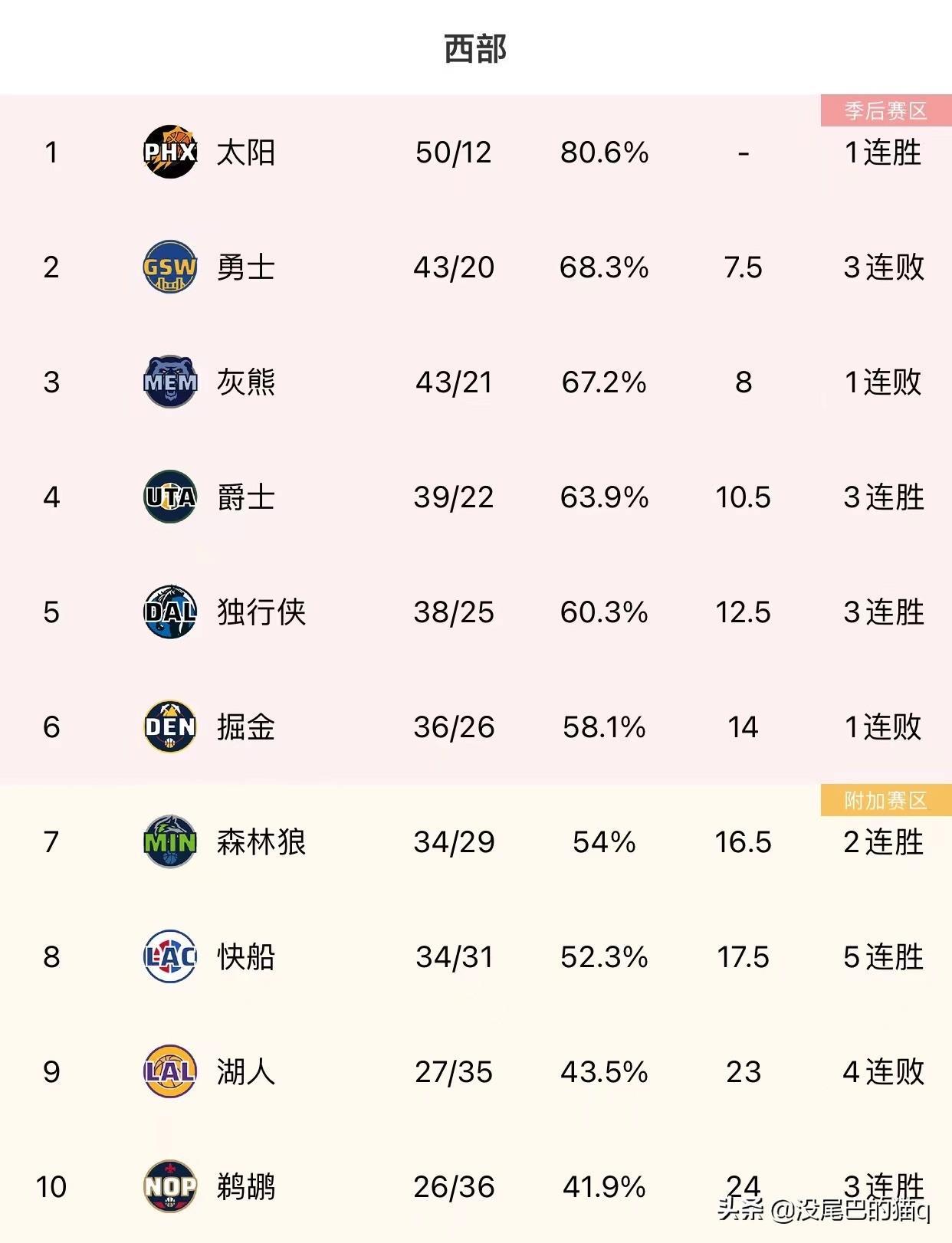 西部方面,勇士、灰熊、湖人今天都陆续输球,虽然没有对排名产生进一步变化,但已经被身后的对手虎视眈眈;太阳依然位居榜首且领先优势较大,灰熊还有半个胜场就会超越勇士;爵士、独行侠、掘金稳定在4-6名;森林狼、快船排名7-8名,湖人即将掉到西部第十,更有可能直接掉出附加赛区无缘季后赛!