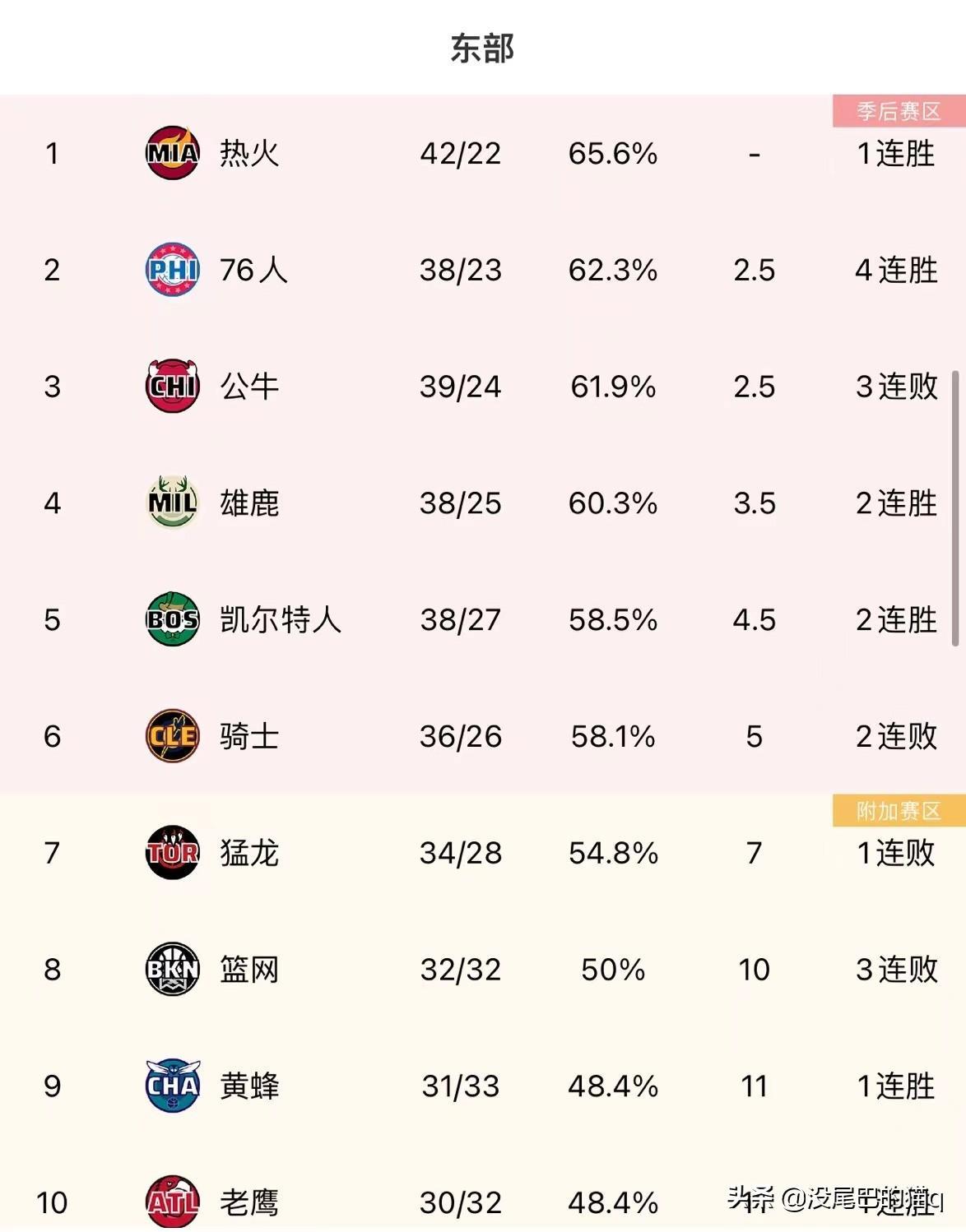 东部方面,热火高居第一,76人目前上升到了第二名,自哈登加盟后球队状态良好,身后是公牛、雄鹿和凯尔特人,战绩总体差距很近;其实排名东部第六,猛龙落后2个胜场排名第七位;篮网今天在杜兰特复出后依然输球,目前排名东部第八,仅领先东部第十的老鹰1个胜场,同样有直接无缘附加赛区的风险!