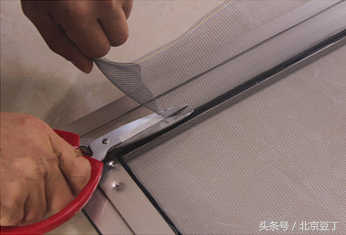 6、压完纱边后,用见到将多余的部分剪掉,进行一下修补,但不要修剪的太多,留下5-10mm可以起到遮挡纱窗缝隙,阻挡灰尘的作用。