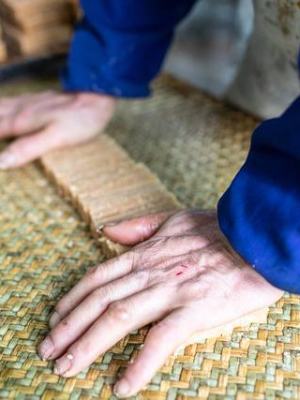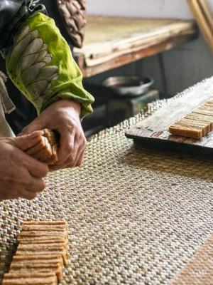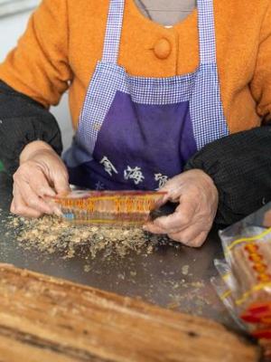 古法制作小片糖,完全是靠手工操作,我看见师傅的手上颜色磨出了许多性寒老茧,每一块小片糖都是他们用双手使劲掰做成出来的。
