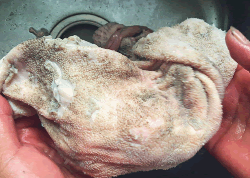 完成以上3步即可轻松洗净羊肚,但是羊肚如果表面有黑膜,那么需要另外的方法才能去除,具体如下: