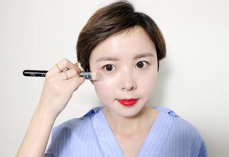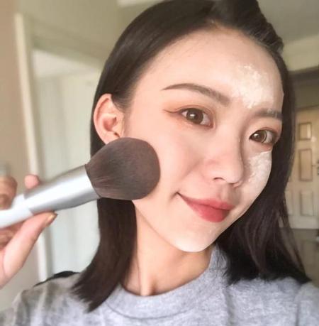 2.然后在容易出油脱妆的地方,比如T区、额头、法令纹地区,用小的美妆蛋或大刷子厚厚的覆盖一层在脸上,等5分钟左右,再用一把干净的刷子把余粉刷掉。这时候的妆容就会变得非常服帖,即使是容易脱妆出油的地方也已经被定的非常牢固了!