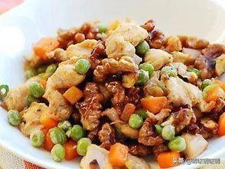 材料:鸡胸肉、核桃、豌豆、胡萝卜、葱、盐、水、淀粉、料酒、鸡精、香油、生抽。