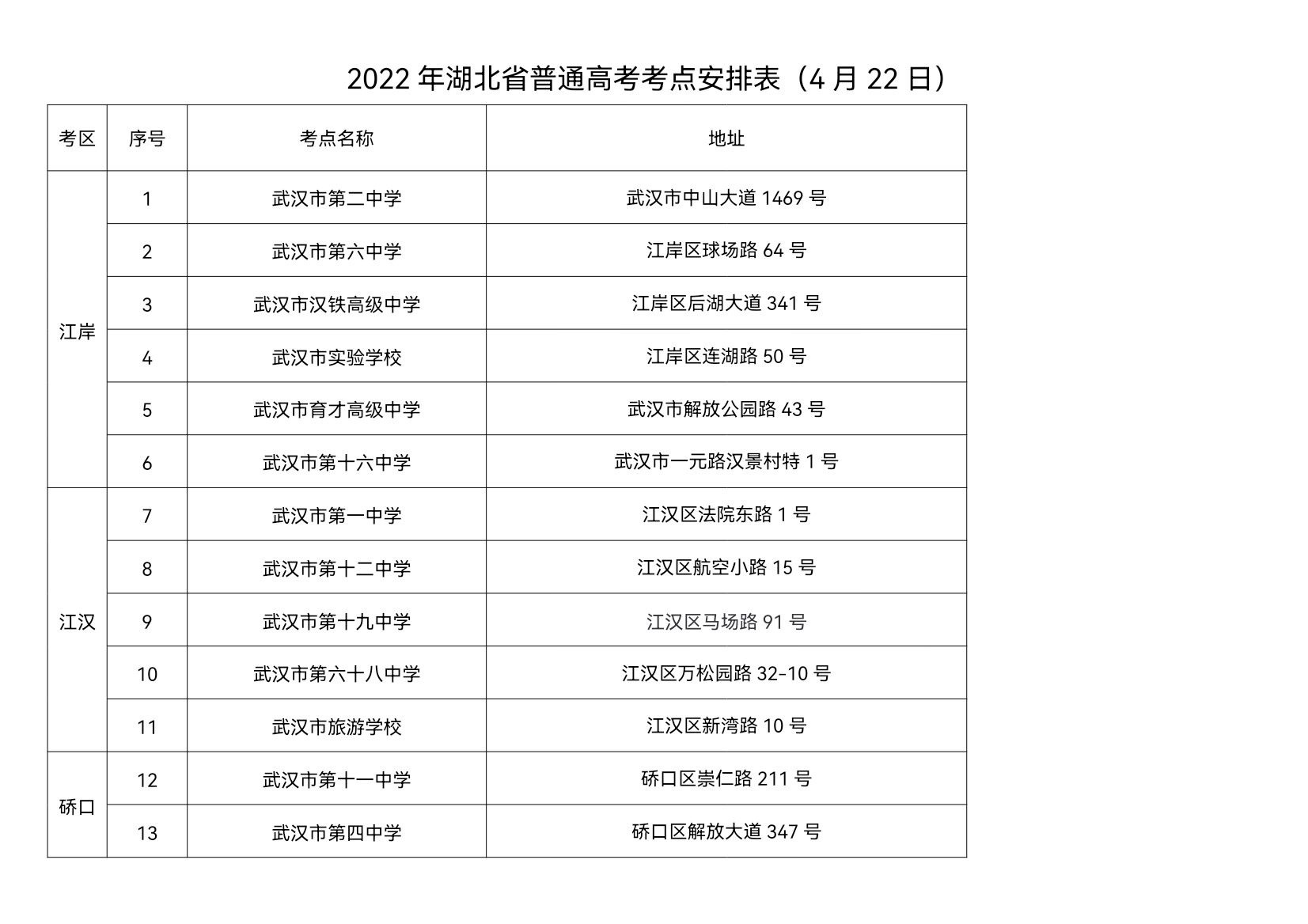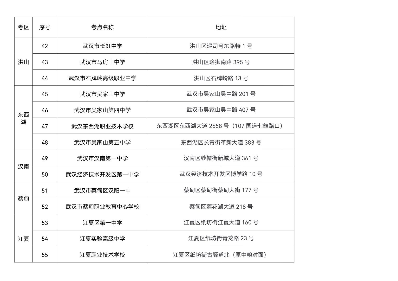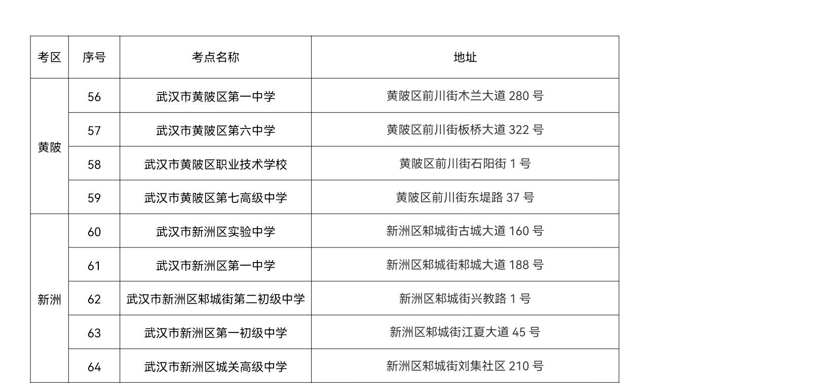 长江日报大武汉客户端6月1日讯(记者刘嘉)6月7日,武汉市6.35万名高考考生将迎来高考。今年,武汉市共设64个高考考点,具体考点和地址如下: