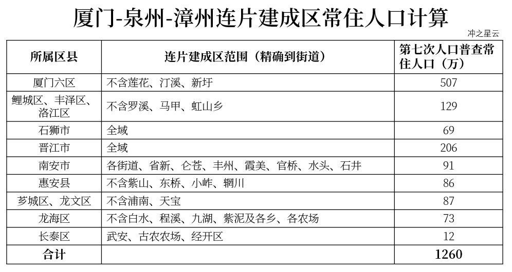 最后,分别计算一下福建省内超大城市厦门-泉州-漳州组合体、以及特大城市福州的连片建成区人口规模: