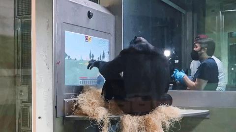 或许是因为之前玩过一些游戏,Kanzi 刚坐到屏幕前就进入了状态,几秒钟就学会了如何操作角色前进。只要它能到达指定区域,屏幕上就会出现零食的图案,同时工作人员也会给它对应零食。在这样的奖励机制下,Kanzi 很快学会了如何在游戏里行走。