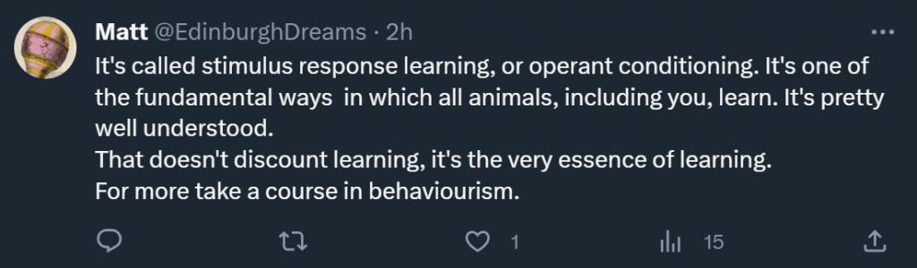 对此,有人反驳说,「这被称为刺激反应学习,或操作性条件反射。这是包括你在内的所有动物学习的基本方式之一。这是很容易理解的。这并不是贬低学习,这是学习的本质。」
