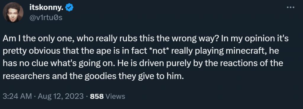 但有人对此提出了质疑,认为 Kanzi 其实只是为了得到奖励才一直继续,「它根本不知道发生了什么,」也并没有真正学会玩《我的世界》。