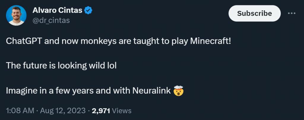 这个实验有趣的地方还在于,它让人脑洞大开:现在 ChatGPT 和大猩猩都会玩《我的世界》了,如果未来脑机接口发展顺利还会发生什么?