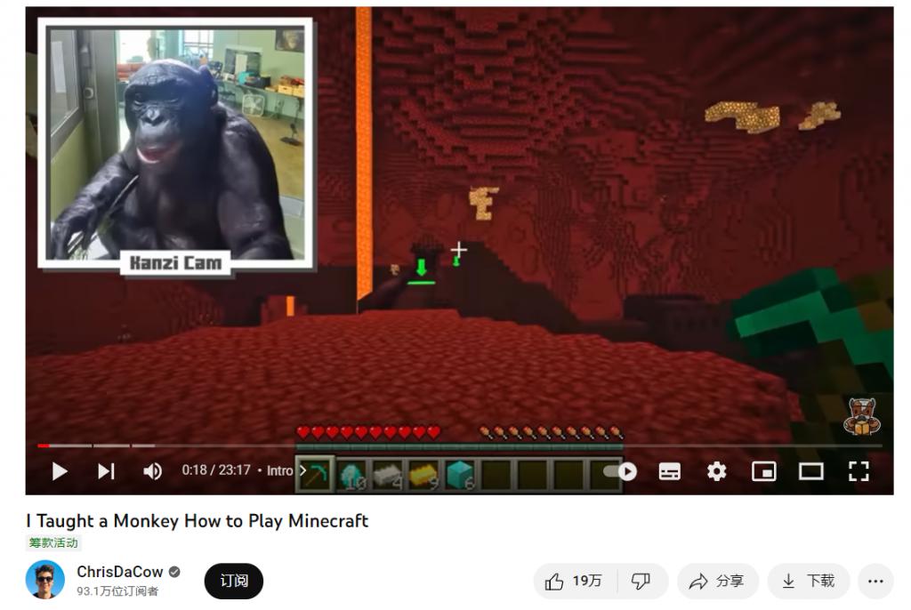 在教会 GPT-4 玩《我的世界》(Minecraft)之后,人类也教会了大猩猩玩这款游戏。