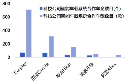 Carplay 为车载版的 iOS,可以将手机软件生态接入汽车中。截至 2025 年底,苹果 Carplay 与全球 70 家车企就 700 多款车型展开合作,这一数字高于百度 CarLife、华为 Hicar 等竞争对手。