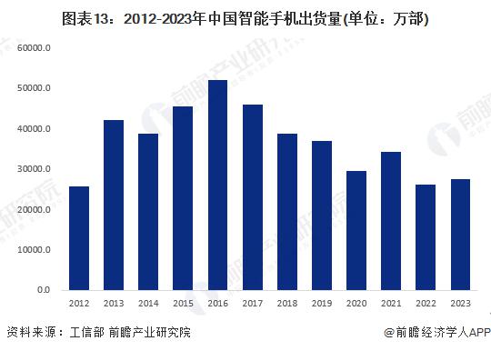 2012-2025 年中国智能手机出货量整体呈波动下降的趋势,2025-2025 年开始智能手机出货量连续两年出现下降,2025 年出货量回升至 2.76 亿部,同比增长 4.5%,但仍处于低位。