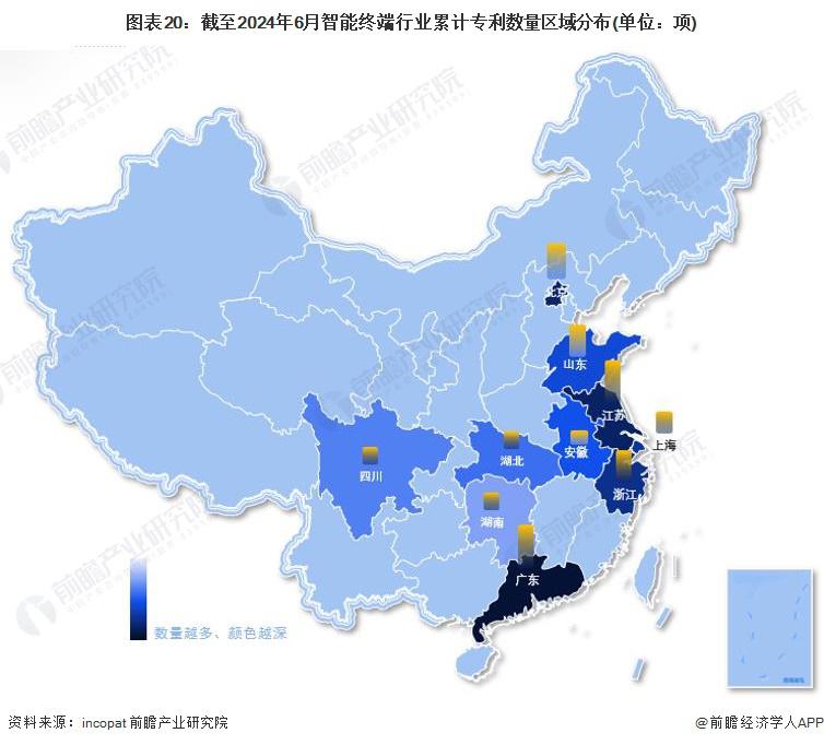 企业数量区域分布方面,我国智能终端企业区域分布呈从东部沿海向内陆地区省份逐渐减少的态势,主要分布在广东省、江苏省和浙江省。