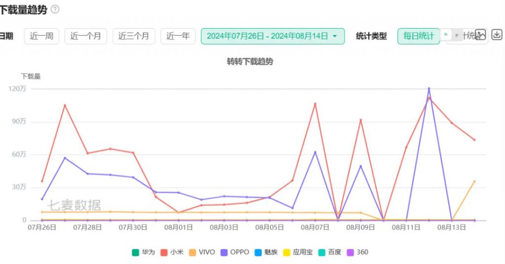自闲鱼公开新规后,转转的安卓端下载量迎来增长 图片来源:七麦数据