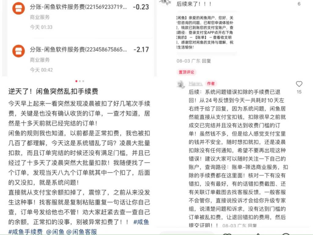 值得一提的是,有卖家提到自己在近期突然被闲鱼乱扣手续费的情况," 闲鱼的规则我也知道,以前都是正常扣费,今天是系统错乱了吗?" 并表示 " 是凌晨大批量扣款,都是很早之前就成交已完结并且没有达到收费门槛的订单。" 而这件事的后续是,闲鱼给出回复并退回误扣的手续费。