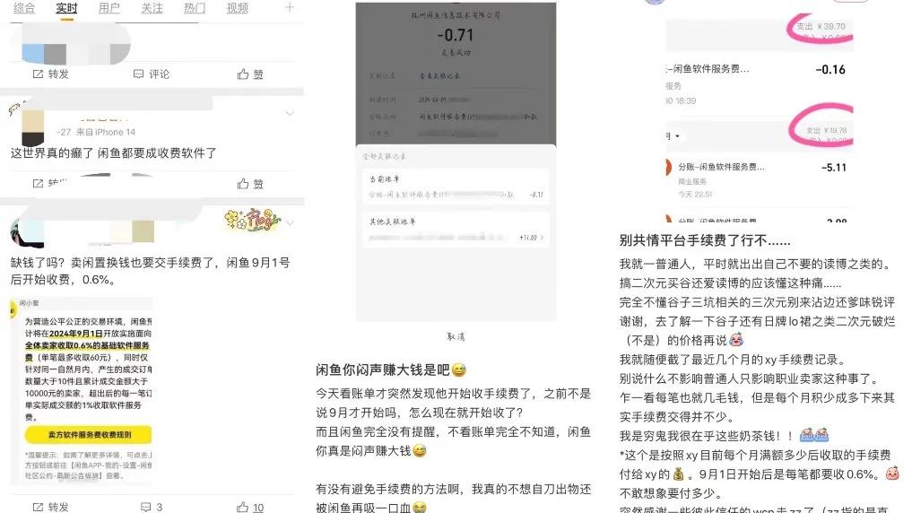 而在微博上,也有不少用户表示不理解," 我卖个五块钱的东西还收我三分钱手续费,还要伺候难缠客户,拜拜了 "" 本来出物都要倒贴钱了,还收我 0.6% 的服务费 "" 缺钱了吗?卖闲置换钱也要交手续费 " ……