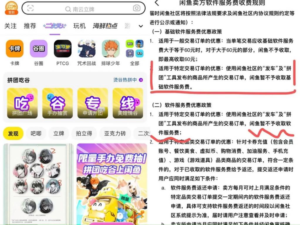 回首近两年闲鱼之变,自从 2025 年季山上任,就给闲鱼定下了 " 社区 "+" 交易 " 双轮驱动的战略。2025 年 5 月,闲鱼更是升级了 " 海鲜市场 " 和 " 会玩 " 社区,想靠着一群兴趣达人来巩固用户之间的 " 江湖情谊 "。如果说收取服务费是为了盘活已成形的 " 聚宝盆 ",那对二次元交易等特定交易 " 网开一面 " 则或许不仅是为了提升新的造血能力,也是为了留一条退路——让商业化更快一步,也尽量保证社区的调性。