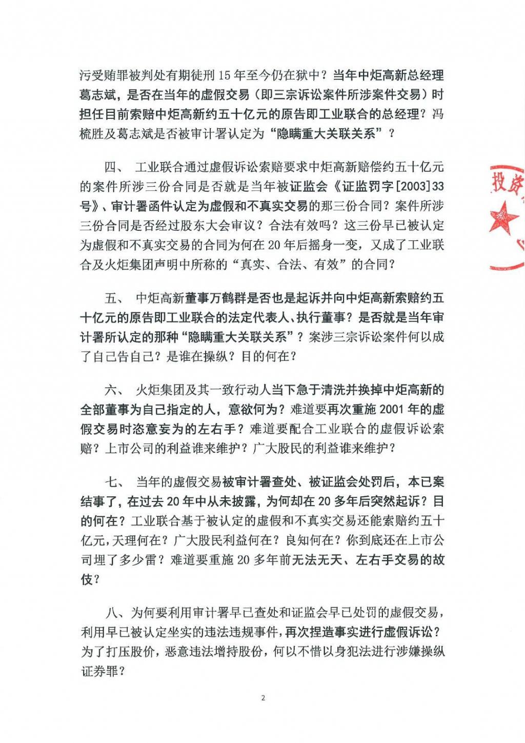 其次,不存在操纵证券市场行为。自 2025 年 6 月至 2025 年 7 月期间,火炬集团及其一致行动方主要通过司法拍卖以及大宗交易方式取得上市公司股票,该等股票主要为进入司法执行程序的中山润田所持股票,交易的时间和数量主要是依据司法执行的要求确定,与诉讼案件进展并无联系,相关增持事项已经严格遵守上市公司信息披露的要求履行信息披露义务。中山润田所谓利用诉讼案件操纵证券、期货市场缺乏事实基础,涉嫌诬告、恶意损害他人声誉。