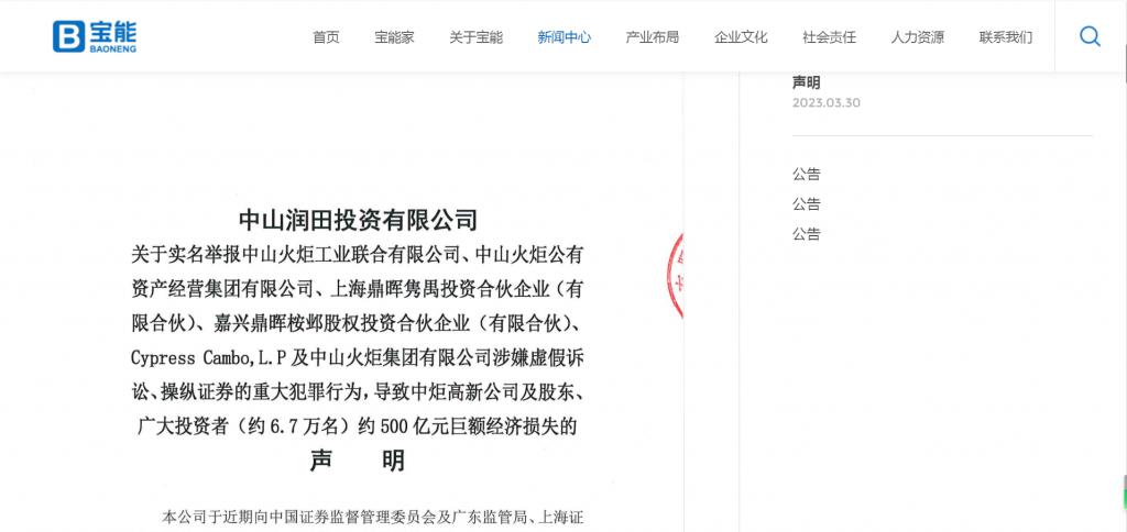 7 月 12 日,中炬高新的 " 宝能系 " 股东中山润田于宝能集团官网发布声明,实名举报中山火炬工业联合有限公司(以下简称:工业联合公司)、中山火炬公有资产经营集团有限公司(以下简称:公资集团)、上海鼎晖隽禺投资合伙企业 ( 有限合伙 ) (以下简称:鼎晖隽禺)、嘉兴鼎晖按股权资合伙企业 ( 有限合伙 ) (以下简称:鼎晖桉邺)、Cypress Cambo,L.P 及中山火炬集团有限公司(以下简称:火炬集团)涉嫌虚假诉讼、操纵证券的重大犯罪行为,导致中炬高新公司及股东广大投资者约 500 亿元巨额经济损失。据悉,上述各股东均为一致行动人。