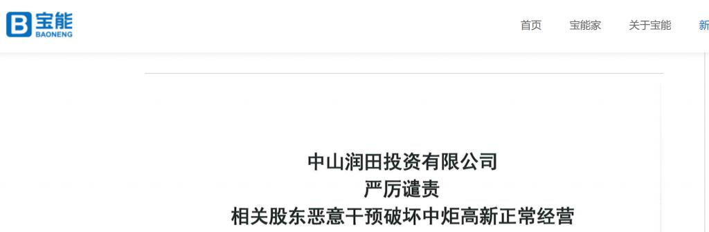 7 月 20 日," 宝能系 " 旗下中山润田在宝能官网再度发表声明并附视频称,中炬高新实际控制人、宝能集团董事长姚振华于 7 月 19 日到中炬高新总部 " 调研生产经营情况 "," 竟被保安拒绝进入 "。