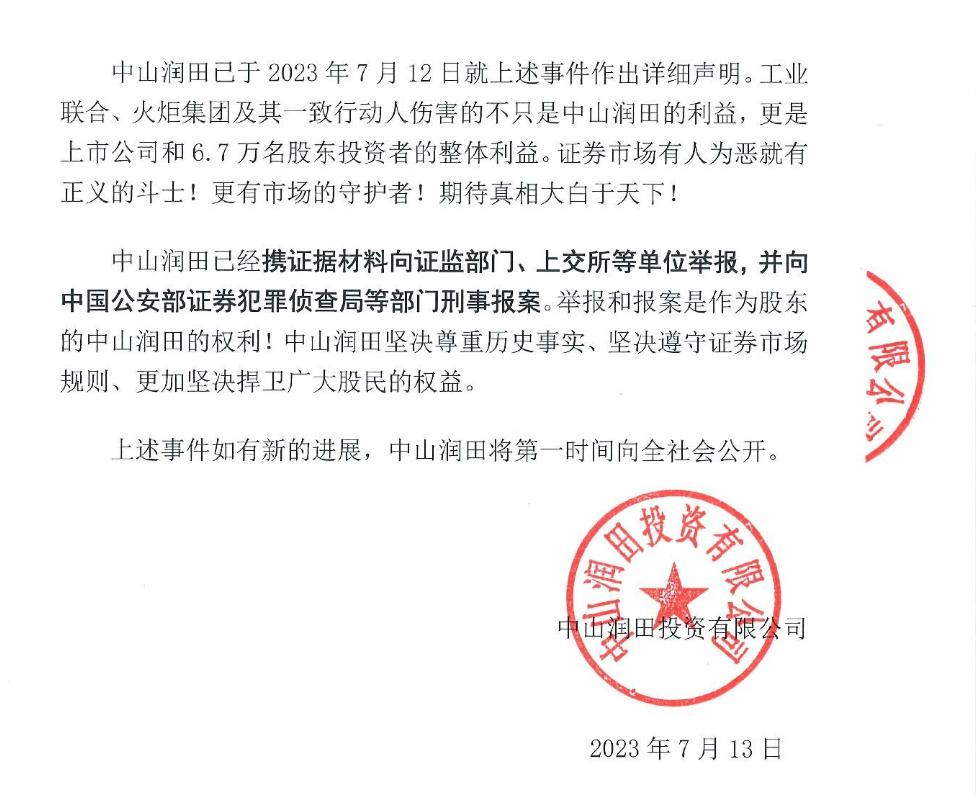 7 月 12 日晚,中山火炬集团有限公司发布了《关于中山润田发布不实信息的严正声明》,《声明》称,中山润田此次发表声明举报,目的包括恶意损害他人声誉,扰乱上市公司正常经营秩序,严重损害了上市公司和上市公司其他股东利益。