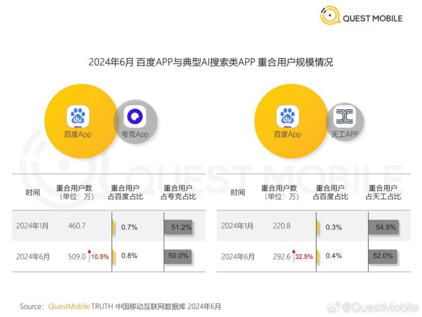 还有一个有意思的现象,据 Quest Mobile 数据,使用新 AI 搜索类 APP 与使用百度 APP 的用户出现了高度重合的现象。以天工 APP 为例,今年 1 月份两者的重合用户数为 220.8 万,到 6 月份增长 32.5% 至 292.6 万。但在各自重合用户占比上却出现了 " 剪刀差 ",重合用户占百度比例上升,占天工比例反而下降。